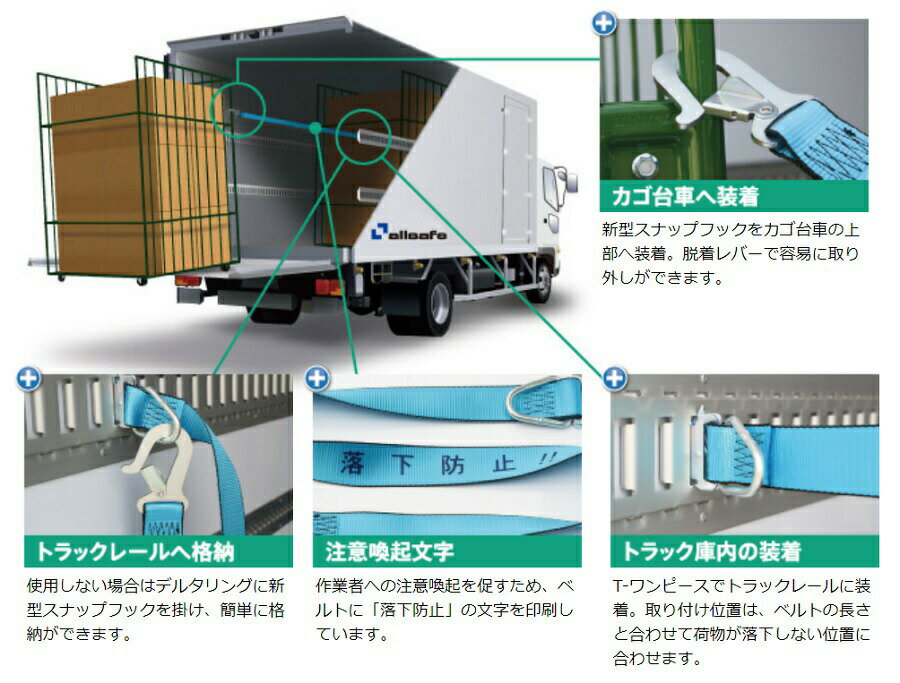 安全輸送機器のトップメーカー オールセーフ 50-RBB-2 オールセーフ カゴ台車落下防止ベルト2本組 【カゴ台車落下防止ベルトの特徴】 カゴ台車にワンタッチ装着。
